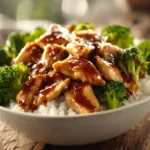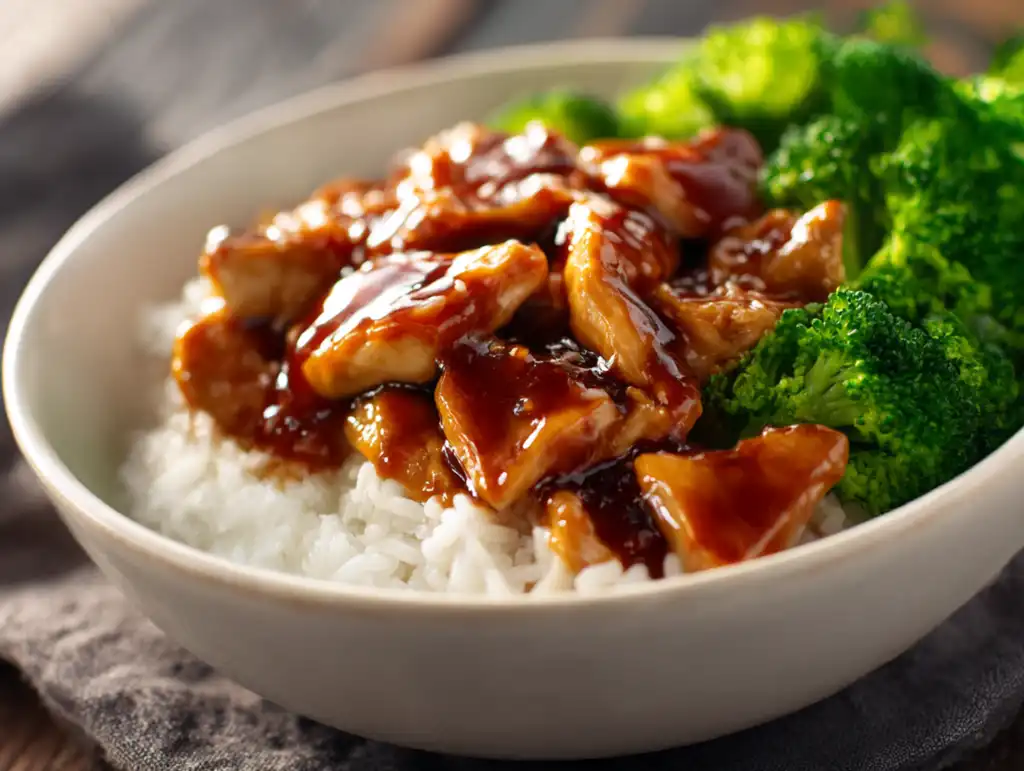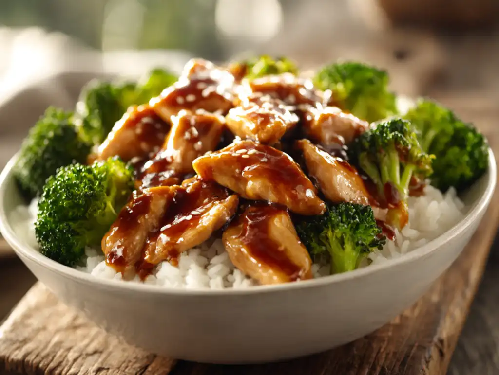 10. Slice chicken. Build bowls with rice + broccoli + chicken; spoon extra sauce on top.