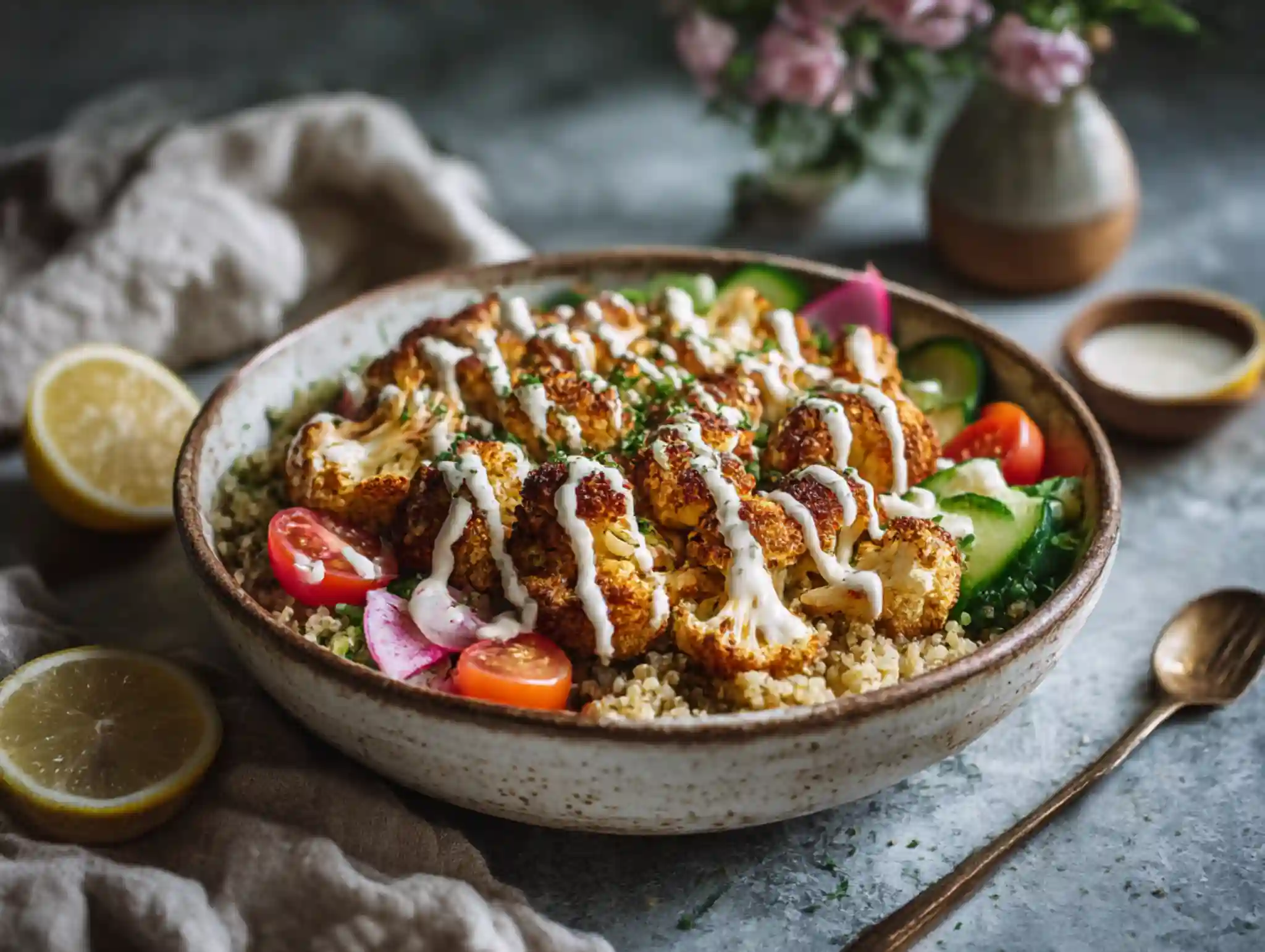 Bold, vibrant, and irresistibly satisfying, this Cauliflower Shawarma Bowl is a plant-based power meal loaded with roasted shawarma-spiced cauliflower, crispy chickpeas, fresh veggies, fluffy quinoa, and a creamy lemon tahini sauce. Naturally gluten-free and vegan—perfect for meal prep, quick lunches, or an easy weeknight dinner.