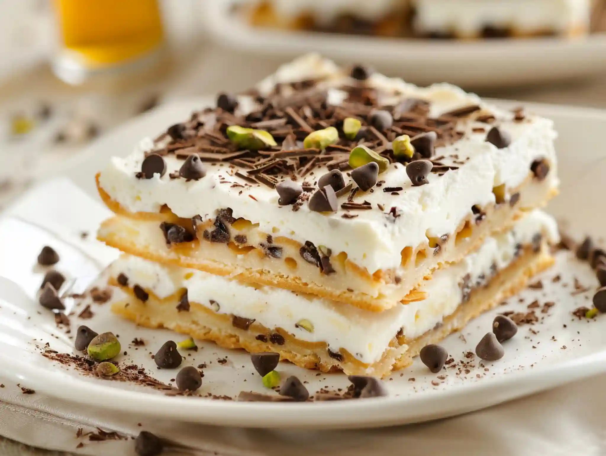Refrigerate for at least 2 hours, or until set. Before serving, sprinkle with pistachios, chocolate shavings, and a light dusting of powdered sugar.