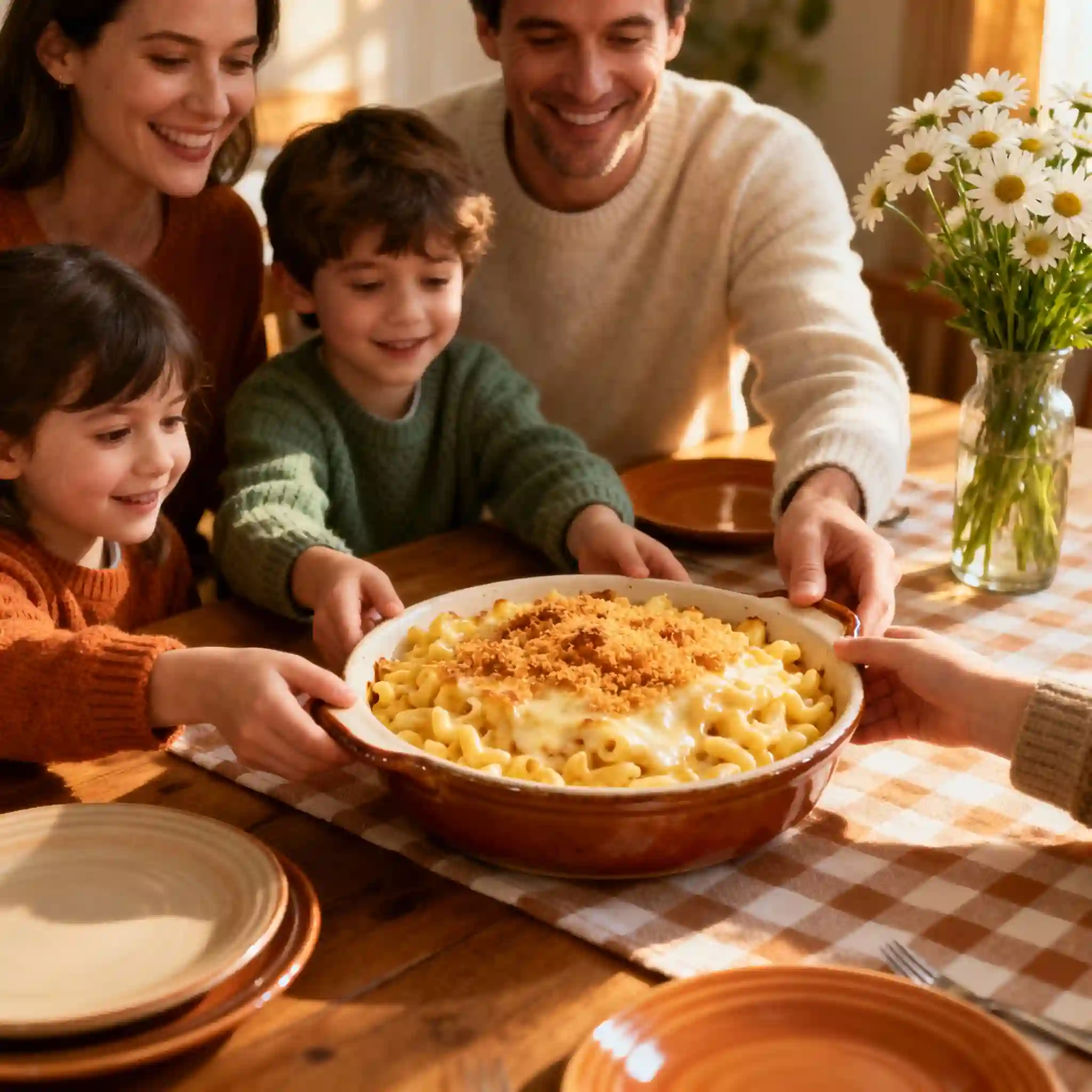 Family enjoying macaroni and cheese served in a warm, cozy home setting.