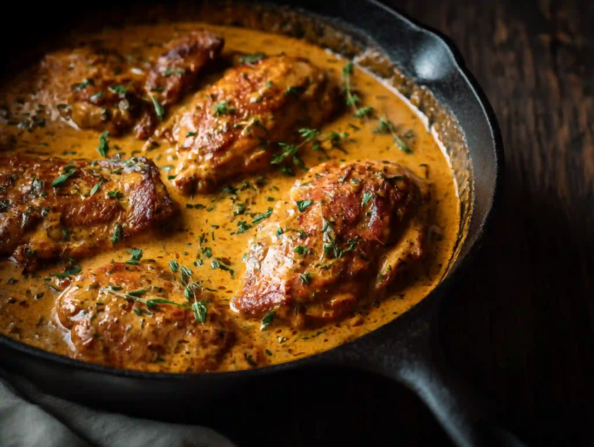 Heat olive oil in a large skillet over medium-high heat. Add the chicken and cook for 4–5 minutes per side, until golden brown. Remove the chicken and set aside on a plate. Don’t worry if it’s not fully cooked yet—it will finish in the sauce.