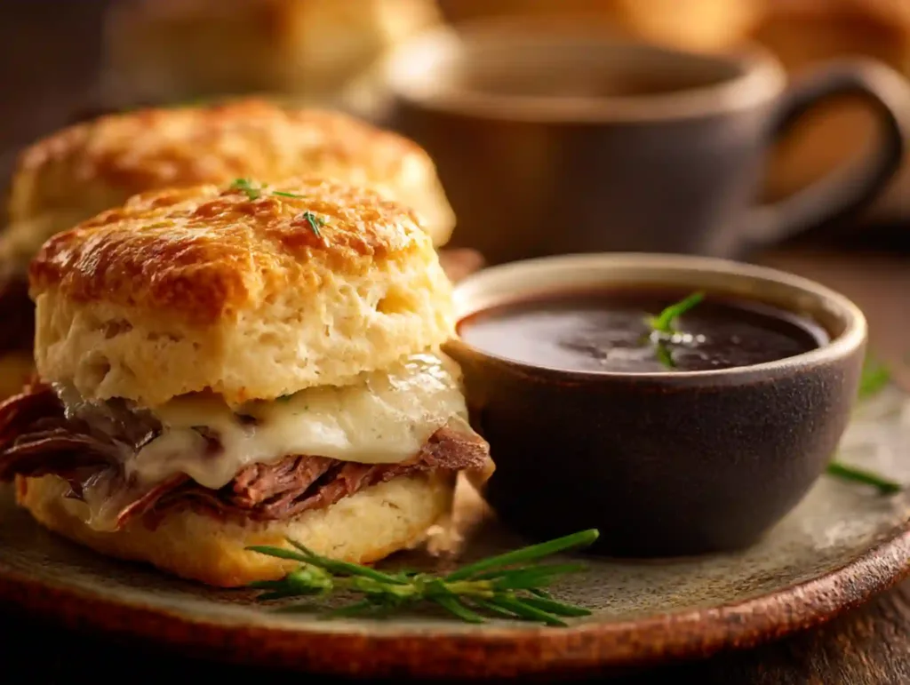 Flaky, golden biscuits stuffed with savory roast beef and melty provolone, brushed with a herbed garlic butter and served with warm au jus for dipping. Fast, cozy, and perfect for weeknights or game day.