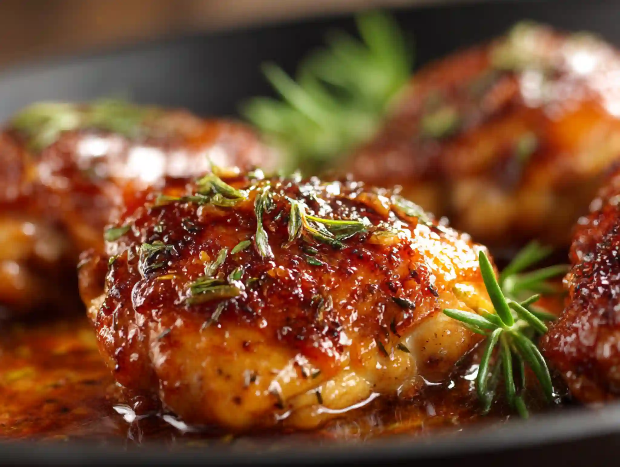 Pat the chicken thighs dry and place them skin-side up in the baking dish. Pour the honey glaze evenly over the chicken.