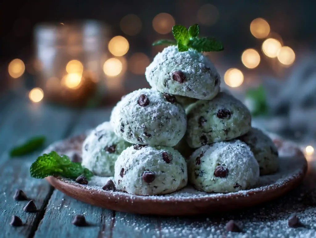 Soft, buttery, minty snowball cookies packed with mini chocolate chips and rolled in powdered sugar for a festive “snowy” finish. Perfect for holiday trays, gifting, and cozy cocoa nights.