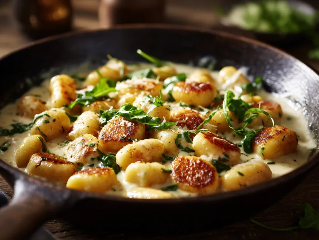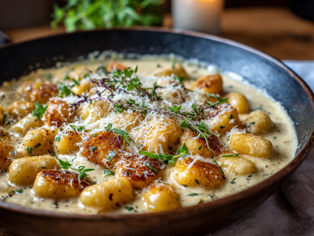 Millionaire Gnocchi with Creamy Sauce is a quick, cozy, gourmet-style dinner made with golden pan-seared potato gnocchi tossed in a rich garlic parmesan cream sauce, finished with rosemary, parsley, and optional chili flakes.