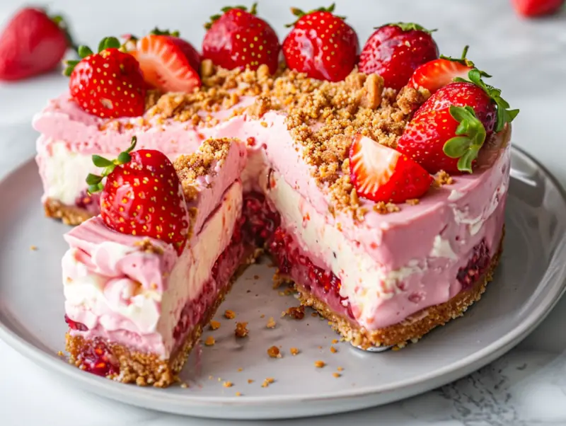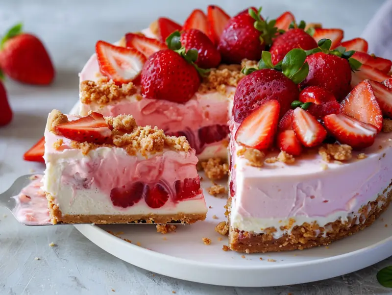 This dessert is all about balance—smooth, fluffy cheesecake meets a buttery crunch with bursts of strawberry flavor in every bite. It’s incredibly easy to make, requires no oven, and looks beautiful on any dessert table. Whether you’re preparing it for a family gathering or a weekend treat, this cheesecake delivers both flavor and texture without complicated steps.